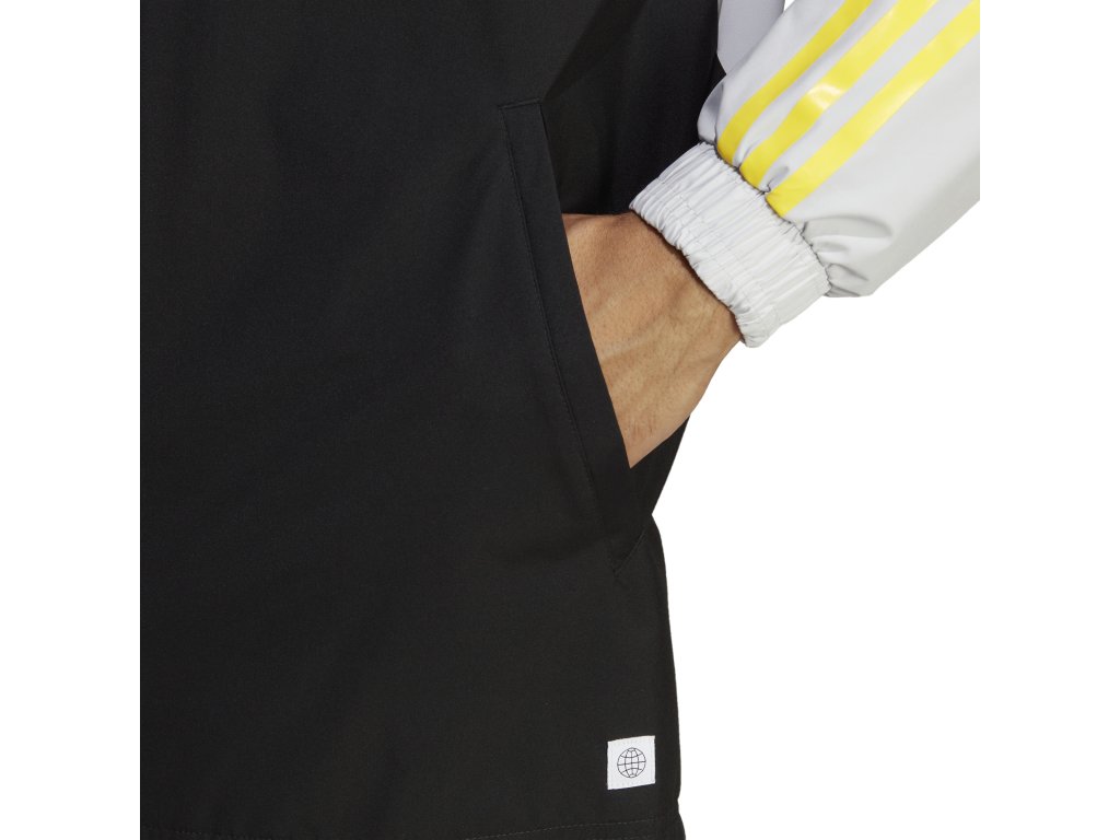 Správný fotbalista neřeší, jestli zrovna svítí sluníčko nebo padají kroupy. Když je čas hrát, tak se jde jednoduše na to. Tuto fotbalovou bundu adidas Tiro 23 Competition All-Weather oblékají hráči při nepřízni počasí, protože je vyrobená z voděodolného tkaného materiálu a má elastické manžety. Další ochranu před deštěm pak nabízí praktická kapuce se stahovací šňůrkou. Produkt je vyrobený minimálně ze 60% z recyklovaných materiálů. Je součástí boje firmy adidas proti plastovému odpadu.