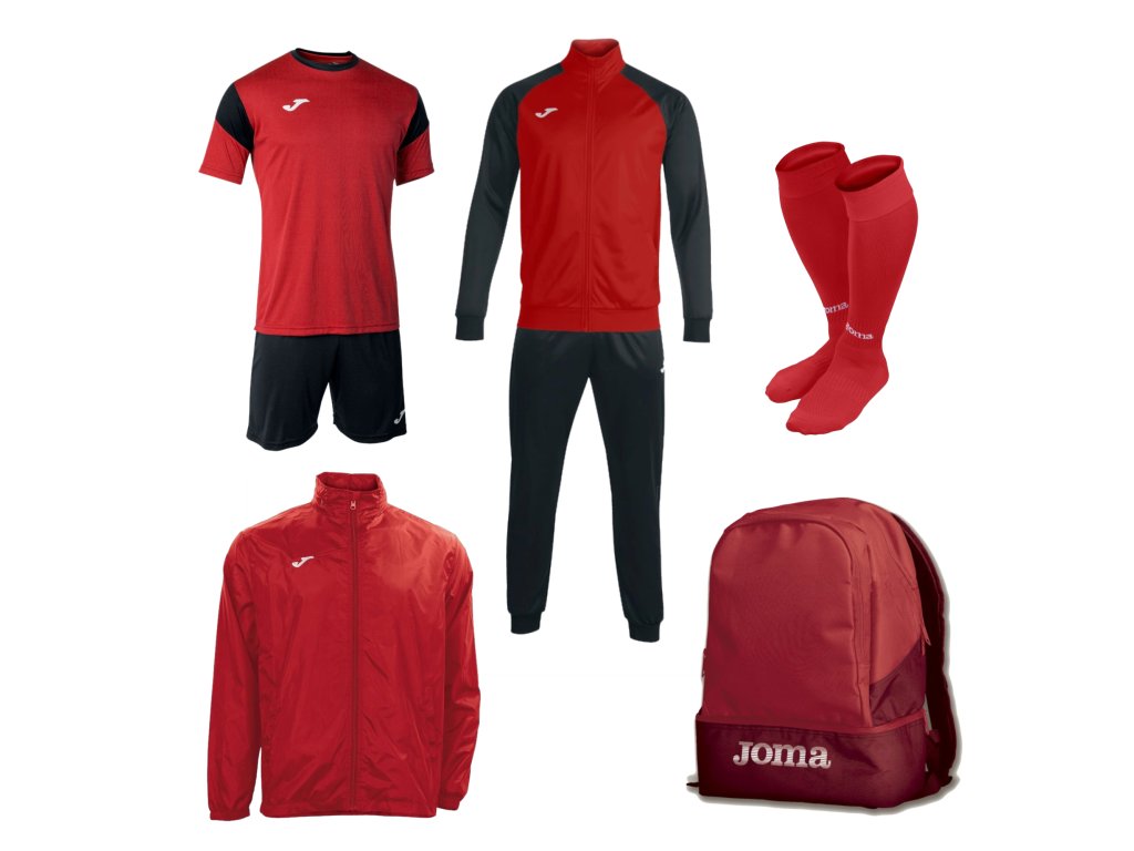 Kompletní sportovní set Joma nabízí ideální výbavu pro trénink i zápas. Obsahuje dres, trenýrky, teplákovou soupravu, bundu, štulpny a batoh – vše pro maximální komfort, funkčnost a jednotný sportovní vzhled.