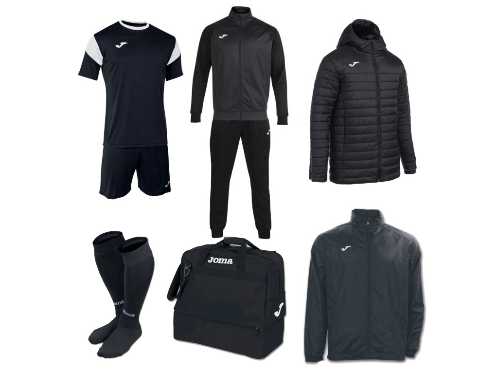 Profesionální sportovní set Joma nabízí kompletní vybavení pro trénink, zápas i chladnější podmínky. Obsahuje dres, trenýrky, teplákovou soupravu, bundy, štulpny a sportovní tašku – ideální volba pro náročné hráče i týmy.