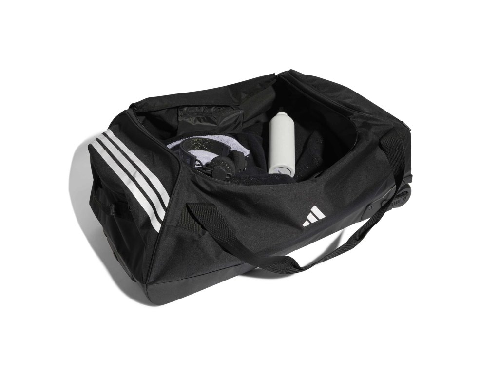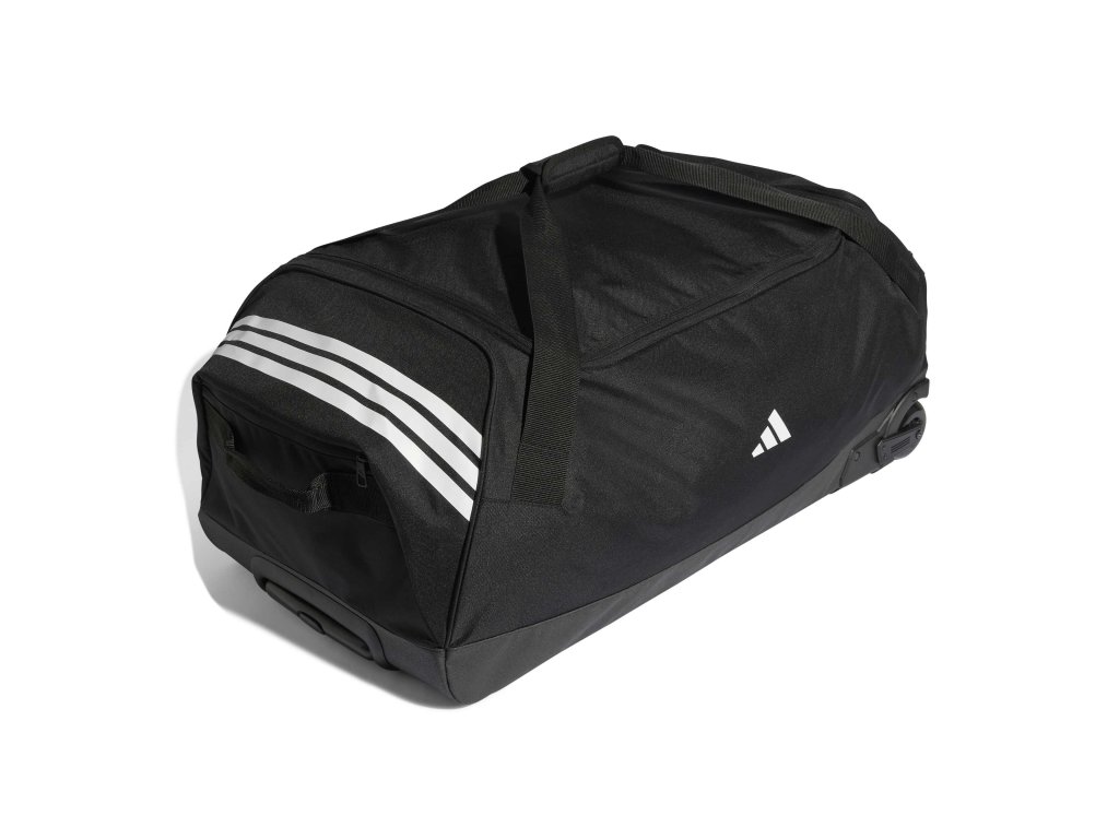 adidas Tiro Trolley XL je robustní cestovní taška s extra velkým objemem, ideální pro týmy a delší cesty. Pevná konstrukce, kolečka a odolný recyklovaný polyester umožňují pohodlnou přepravu velkého množství sportovní výbavy.