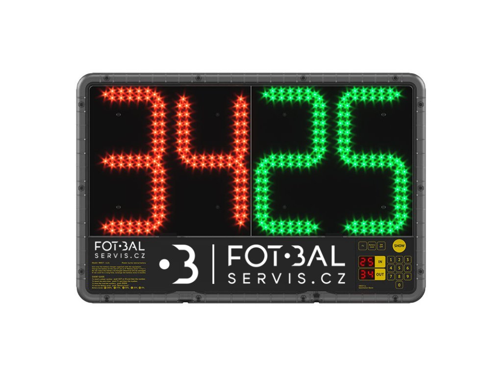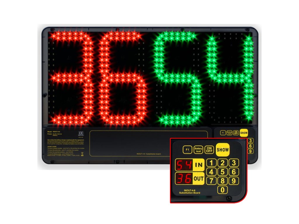 Oboustranná elektronická střídací tabule umožňuje zobrazit čísla hráčů, kteří odcházejí ze hřiště a přicházejí na hřiště a také údaj o nastavení hry. Zelené číslice zobrazují číslo hráče vstupujícího do hry, červené číslice zobrazují číslo hráče odcházejícího ze hry.