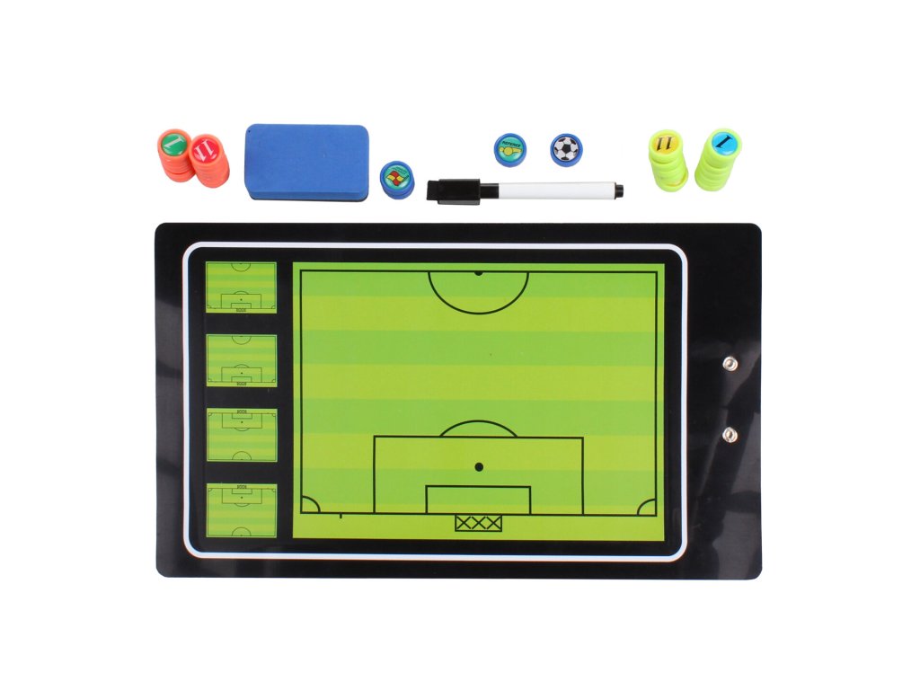 Taktická tabule je svými rozměry (25x41 cm) ideální do ruky. Trenér tak může na střídačce v rychlosti vysvětlit taktiku. Na jedné straně tabule je jen půlka hřiště, na druhé straně je hřiště celé. Tabulka má klipsnu na fix, který je, spolu s malou mazací houbičkou, také součástí balení.